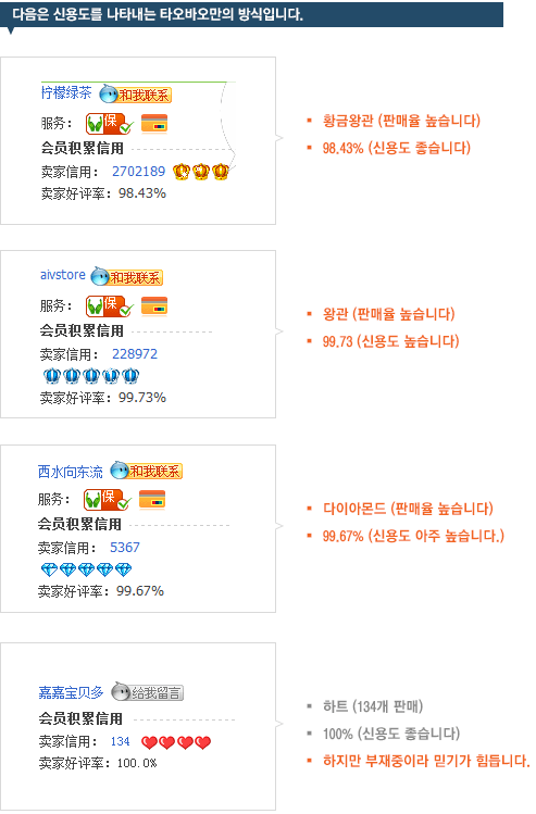 아래의 마크들은 타오바오(중국옥션)에서 자격이 되는 판매자들에게 부여한 마크들입니다.